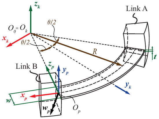 As is known (see e.g., [43,44,45]), the small deflection behavior of either a single slender beam or a flexure-based system in the proximity of an unloaded configuration can be described in terms of a stiffness matrix or, equivalently, of a compliance matrix, whose definitions are hereafter briefly recalled. Let us first underline that, in the following, the left superscript of a vector or a matrix will denote the coordinate frame in which its components are expressed, whereas T will denote a vector (or matrix) transpose. Let us then consider a single slender beam (such as the CFB schematized in Figure 2), connecting a fixed rigid link A to a movable rigid link B and loaded by an external wrench, , acting on a point of link B. This external wrench is composed of a force vector, , and a torque vector, , whose components are expressed with respect to a generic end link coordinate frame (with axes , , and origin at point ). The corresponding small displacement, representing the link B deflection due to the applied load, can be expressed via the vector , which is composed of an infinitesimal translation, , and an infinitesimal rotation, , measured in the same coordinate frame . The relations between and can be expressed as:
