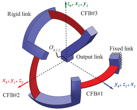 The symbols and respectively denote the adjoint matrix and the rotation matrix of frame with respect to frame , whereas denotes the skew symmetric matrix of the position vector , which locates the origin of frame with respect to frame . Each term in the sum, namely (or, respectively, ) simply relates each matrix previously computed in the generic frame to the new frame . Note that mixed combinations of parallel and series generalized spring-like elements require similar groups to be combined first then inverted as necessary to complete the combination. For spherical CMs like those considered here and depicted in Figure 1, Figure 2 and Figure 3, made by the connection of CFBs with coincident centers coinciding with the desired center of spherical motion, , a suitable frame is the one having origin at and with axes suitably defined in order to obtain (if possible) a diagonal compliant matrix [46], hereafter referred to as . In this particular frame, the matrix for an ideal spherical CM, expected to provide a purely spherical motion, should present finite (usually, as large as possible) lower-right diagonal terms (namely, , , ), all the other terms being null. In case of practical (non-ideal) spherical CMs, a measure of the magnitude of all the other non-zero matrix entries can be used to assess the spherical CM behavior for what concerns undesired parasitic effects.