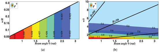 In order to perform a scale-independent parametric study, the curvature radius R of the CFBs is used as the characteristic size to obtain the dimensionless ratio that only depends on the flexure shape factors , and . After performing parametric evaluations, within the limits of the slender beam approximation, the results show that is almost independent of the relative width, , so that its variation can be represented as a function of beam relative length (namely, ) and the cross-section aspect ratio () only. Exemplary numerical results are respectively depicted in Figure 5a,b. In these pictures, the black inclined straight lines (for given ratios) are included in order to indicate the space of the geometric parameters that satisfy the slender beam approximation, the admissible geometries being those lying on the bottom-right side of the line. In particular, Figure 5a underlines the negligible influence of on the parameter for the case (similar results also hold for different values of the cross-section aspect ratio ). In parallel, Figure 5b reports about the influence of and on the same parameter. Overall, the results indicate that can be minimized by selecting the largest feasible values for and for which the flexible members can be considered as a slender beam.