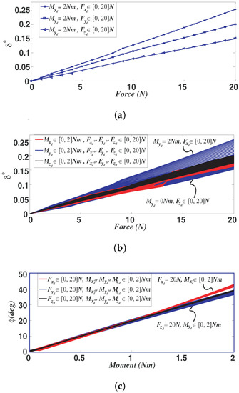 Starting from the relation between parasitic displacements and desired rotations, simulations indicate that the total displacement of the joint center is mostly dependent on applied forces, whereas its rotation mainly depends on applied moments. In particular, Figure 7 demonstrates the variation of and for different loading cases in frame . For instance, Figure 7a reports the variation of parameter when a constant external moment, Nm, is applied along the axis, whereas either forces , , (in the range from 0 to 20 N) are applied on the respective axes. The same curves are also reported in Figure 7b, which however depicts all the possible loading-case combinations, namely, Nm and varying from 0 to 20 N. Since, for each moment load, 21 simulations have been performed (i.e., moments increasing from 0 to 2 Nm with increments of 0.1 Nm, as previously said), Figure 7b depicts the overlay of 63 curves in total. As one can notice, the dimensionless total displacement of the joint center increases almost linearly with increasing forces. A minimum measure is achieved for Nm and a varying force, , applied along the axis. A maximum measure is achieved for Nm and a varying force, , applied along the axis. In parallel, Figure 7c represents the quasi-linear dependency of the joint desired rotation as function of applied moments, namely varying from 0 to 2 Nm and parametric forces N, increasing with increments of 1 N (i.e., 63 curves in total). The minimum measure is obtained for Nm and a varying moment, , applied along the axis, whereas the maximum measure is obtained for N and a varying moment, applied along the axis. According to Figure 7b,c, there exists three extreme load cases scenarios for what concerns the measures and : (a) a combination of and (case of maximum parasitic displacement); (b) a combination of and (case of maximum desired rotation); (c) a combination of and (case of minimum desired rotation and minimum parastic displacement). For the sake of clarity, it is recalled that all loads are applied to point that is envisaged as the SJ center of spherical motion.