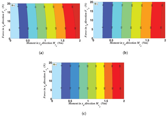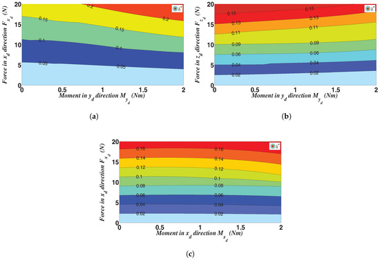 For these three extreme loading cases, more detailed contour plots are represented in Figure 8, Figure 9 and Figure 10. In particular, the contour plots of the dimensionless parasitic displacement in terms of moment and force are shown in Figure 8 for the three mentioned loading cases. As stated before, is mostly dependent on force variations (in fact, the curves are nearly horizontal), although a minor dependency on the applied moments can also be noticed. The relationship between and the applied moments is mostly dependent on the direction of the applied loads in frame and how the SJ is deformed. For instance, for application of moment and force , as reported in Figure 8a, increases by increasing . On the other hand, this relationship is inverse for the application of the same moment , when the joint is contemporarily loaded by a force , as shown in Figure 8b. A similar interpretation can be underlined for the SJ desired rotation with respect to the applied forces by comparing the rotation contour plots (namely parameter ) depicted in Figure 9. In fact, in this case, the isolines are almost vertical. At last, the contour plots of the ratio , representing a measure of parasitic rotations, are illustrated in Figure 10. This picture clearly highlights that, for relatively high moment loads in any direction, a value of less than can be achieved. This latter value increases whenever the moment loads decrease and the force loads increase (upper left corner of the plots). Finally, contour plots for all the other loading cases are reported in Appendix A, for the sake of completeness.