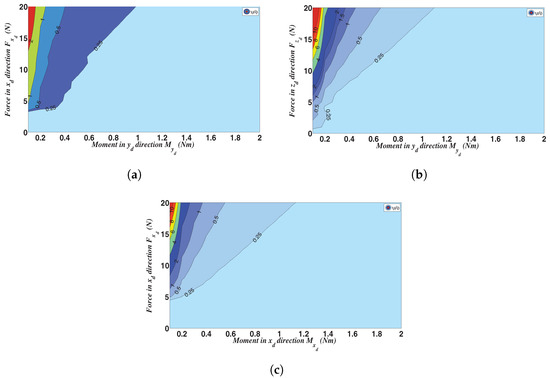 Contour plots of for three extreme loading cases: (a) moment and force ; (b) moment and force for ; (c) moment and force .