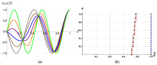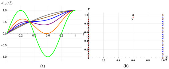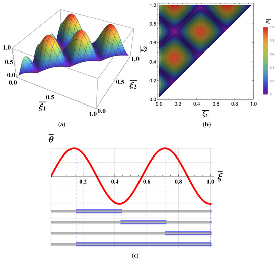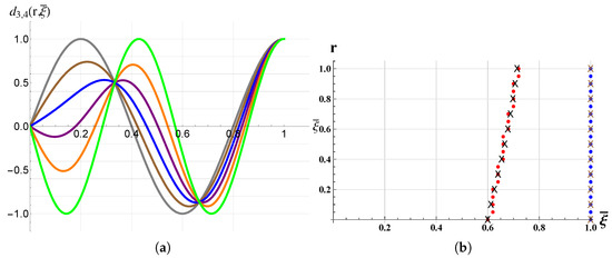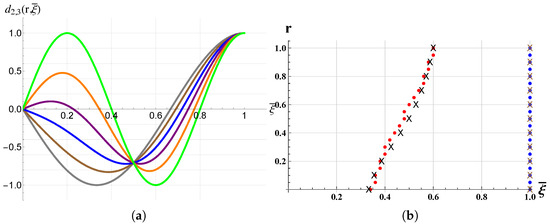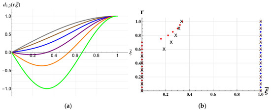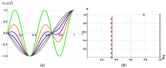 In order to validate the model described above, numerical simulations have been done by the frequency response function of a FEM code. The first five eigenmodes, and their pairing, have been taken into account. The optimal placement of the piezoelectric plates is considered to be the one that minimizes the amplitude of or, in other words, the one that maximizes (see (16)). The numerical results for the single mode damping are reported in Figure 3, Figure 4, Figure 5, Figure 6 and Figure 7 where in (a) there are the three dimensional plot of the , in (b) the contour plot of the same function and in (c) the functions and the optimal placement that derives from the numerical simulations. It is possible to observe that the numerical simulations confirm the results predicted by the model; in fact, the ends of the optimal placement coincide always with the positions of a maximum and a minimum (or vice versa) of the considered eigenmode. Obviously when the modal order number increases, the number of optimal positions increases too because the number the extrema of the eigenmode considered increases. The results for coupling between two modes are reported in Figure 8, Figure 9, Figure 10, Figure 11, Figure 12 and Figure 13. In (a) are reported the functions for different values of r, in (b) the comparison between numerical and model results. By the FEM simulations, the optimal positions for different combination of modes, of the left ends (red points) and the right ends (blue points) of the piezoelectric plates have been reported. The × represent the analogous results for the analytical model; it is possible to observe that they are in very good agreement with the numerical simulations. It is possible to notice that, when r increases, while the right end remains fixed at the free end there is a shift of the left end towards the free end. This different behavior can be explained by observing the shape of and how it changes with r. In fact it is noted that while the position of the absolute maximum in (that coincides with the position of the right ends of the piezoelectric plates in their optimal position) never change and remains fixed at the free end, this is not so for the absolute minimum close to it. Indeed, the increment of r induces a transition to a higher vibrational mode (>) and a consequent movement of this absolute minimum of toward the right. For example, observing (but it is the same for all functions) for the shape of is that of the second torsional mode with an absolute minimum in while for it has the shape of the third torsional mode with an absolute minimum in . For values of r between 0 and 1, this absolute minimum is located between these two values. Thus, the sharp transition of the left end near for coupling between first and third mode and between second and fifth mode is explained. Focusing on , for example, it is noted that for this absolute minimum is in , as r grows a relative minimum appears (, ) but this becomes an absolute minima only when .