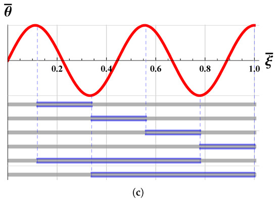 Considering that the loads that produce the highest vibrations are those with the frequencies equal to the eigenfrequencies of the beam, the focus will be on this type of load. The action of the piezoelectric plates is greater the smaller the amplitude is or, in other words (see (16)), as the amplitude is increased. In this paper, among all the possible piezoelectric plate distributions, which means among all the possible choices of , what makes maximum will be considered optimal. Considering only loads that excite one or two eigenfrequencies and indicating with and the excited modes, the applied moment vector Q will have the following expression:
