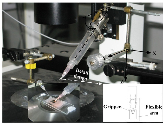 - Inoue, K.; Tanikawa, T.; Arai, T. Micro-manipulation system with a two-fingered micro-hand and its potential application in bioscience. J. Biotechnol. 2008, 133, 219–224. [Google Scholar] [CrossRef] [PubMed]