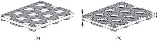 Working principle of dielectric elastomer actuators with rigid perforated electrodes: (a) undeformed configuration; and (b) configuration deformed by the applied voltage.