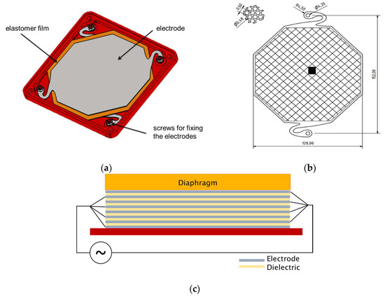 - Heydt, R.; Kornbluh, R.; Pelrine, R.; Mason, V. Design and performance of an electrostrictive-polymer-film acoustic actuator. J. Sound Vib. 1998, 215, 297–311. [Google Scholar] [CrossRef]