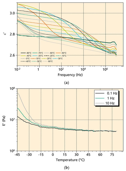 The loudspeaker shown in Figure 2 was obtained by stacking alternating layers of elastomer and perforated electrode. The elastomeric layers were made of natural rubber, Thera-Band extra thin Resistance Band. Its Young’s modulus was determined by a dynamic mechanical analysis (DMA) for various frequencies and temperatures (Figure 3a). Its loss factor was determined to be 0.07 (at 10 Hz, 20 °C) and thus smaller than almost all other materials used for dielectric elastomers. The low damping helps in lowering mechanical and thermal losses for operation at high frequencies. Its relative dielectric permittivity was measured using dielectric relaxation spectroscopy (Figure 3b).