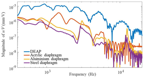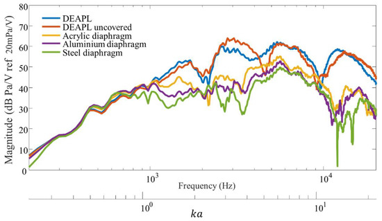 The loudspeaker behaves as an ideal rigid piston, with a clear threshold at 900 Hz, when an additional diaphragm is added on top of the top electrode. However, the material of the diaphragm has a minor effect on the total response. The overall response is dependent on the actual mass of the top layer and the high frequency region seems to be mostly mass-controlled. Although the coincidence frequency decreases from acrylic to aluminium and steel plate there is no evident effect in the results of Figure 9. It has to be noted that the weight of the additional diaphragm increases the pre-compression of the elastomer layers and potentially increases the nonlinearity of the system.