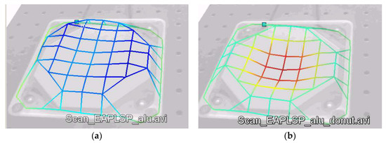 Visualisation of the top electrode displacement at two different driving frequencies: (a) 1.6 kHz; and (b) 3 kHz.