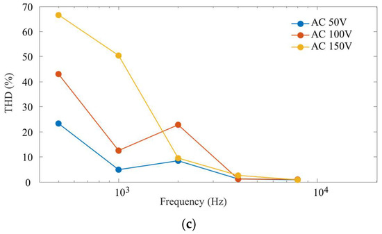 where is the fundamental component and are higher order components. Five pure tone sine waves were generated at 500 Hz, 1 kHz, 2 kHz, 4 kHz and 8 kHz. DC bias was kept constant at 800 V. For each measurement, the power spectrum was obtained to identify the amplitude of the harmonic. Figure 7c shows that an increase in the alternating voltage increases the distortion of the DEAP.