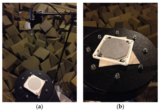 Experiment to measure directivity in a semi-anechoic: (a) DEAP loudspeaker mounted on a turntable; and (b) DEAP loudspeaker with a steel backing.