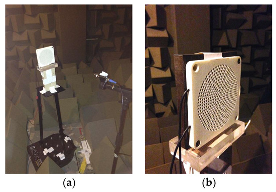 On-axis measurements in the semi-anechoic chamber: (a) microphone setup; and (b) DEAP loudspeaker without enclosure cover and a steel plate used as DEAP loudspeaker diaphragm.