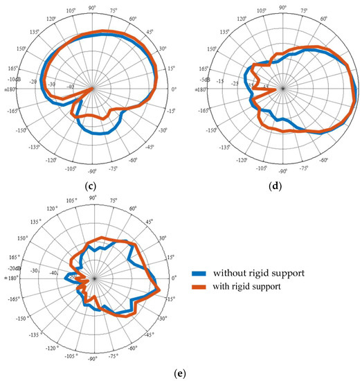 Comparing directivity patterns, with and without a rigid back support: (a) 500 Hz; (b) 1 kHz; (c) 2 kHz; (d) 4 kHz; and (e) 8 kHz.