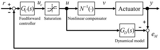 In this section, a controller design method is explained. The block diagram of the control system is shown in Figure 2. The control system consists of an inverse compensator of static nonlinearity N−1, a feedforward controller GC, and a nominal model GD.