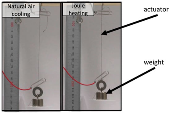 The electroactive TCPA used in the experiments was fabricated by the silver-plated nylon thread (AGposs 100/2, Mitsufuji, Kyoto, Japan). The fabrication method is the same as our previous paper []. The nylon thread in an uncoiled state is 300 mm in length and 0.1 mm in diameter. The nylon thread in a coiled state is 85 mm in length and 0.4 mm in diameter after overtwisting. The configuration of the actuator is 100 mm in length and 0.3 mm in diameter. The electric resistance is 74.2 Ω in an unloaded condition. The behavior of electric activation of the electroactive TCPA is shown in Figure 3. The length of the actuator is 100 mm. When a 20-g weight is attached to the end of the actuator, the maximum strain of the actuator is about 10% by 10 V.