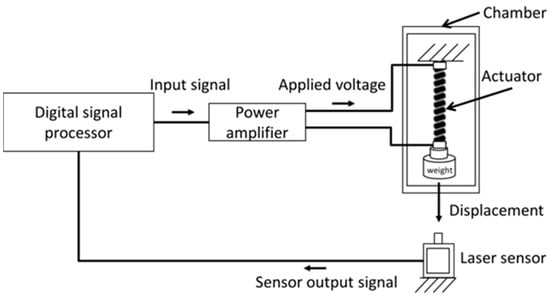 A schematic diagram of our experimental environment is shown in Figure 4. In the environment, a real-time measurement and control system is implemented by using a digital signal processor system (MTT, Tokyo, Japan, SBOX2). A control program is built in MATLAB/Simulink and loaded to the digital signal processor system. The control input signal is computed in a digital signal processor and applied to the power amplifier. The power amplifier outputs the driving voltage according to the control signal. The output displacement of the actuator is measured by a laser displacement meter (KEYENCE, Osaka, Japan, IA-100), and the displacement data is input to the digital signal processor. The displacement is defined as the shrinkage ratio [%] of the initial length of the actuator. The sample time of the controller is set as 1 ms. The actuator is placed in a chamber (As-one). In the experimental environment, the temperature in the chamber is set as 23 °C, and a weight of 20 g is attached to the actuator.