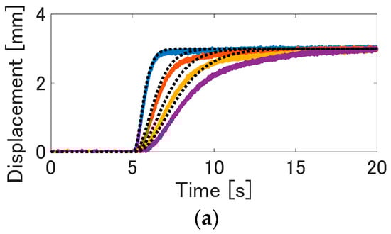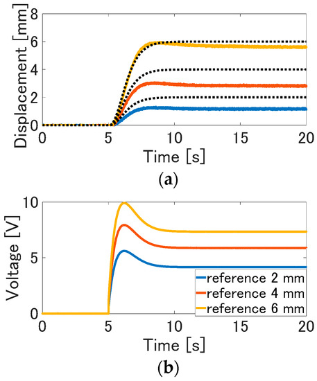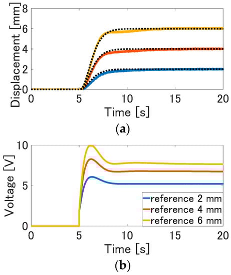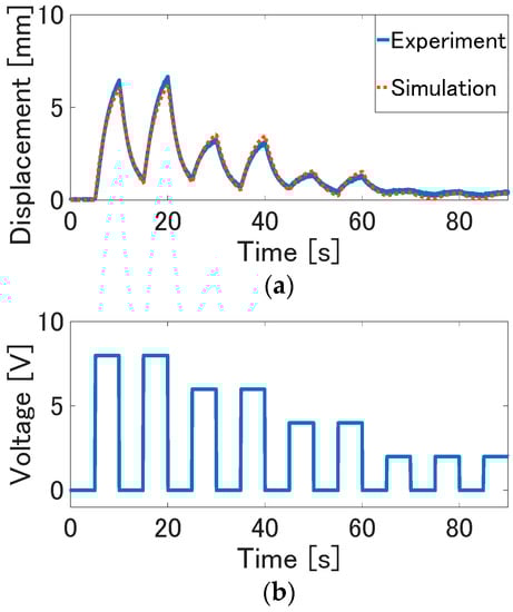 In case of overheating, these model parameters might be varied in response to the input voltage, since the materials property of the TCPA depends on the temperature. Furthermore, in case of excessive contraction, these parameters might be varied due to the coil–coil contact. These factors should be considered for the wide range activation [,]; however, our modeling method is effective for normal use of the feedback control, since the simple controller design and adequate control performance can be realized, as described later.