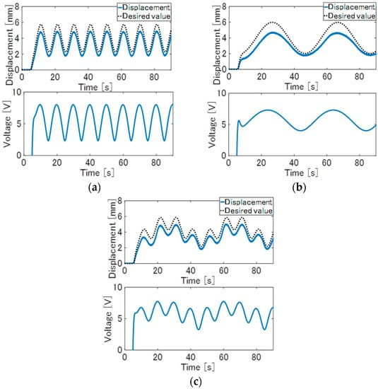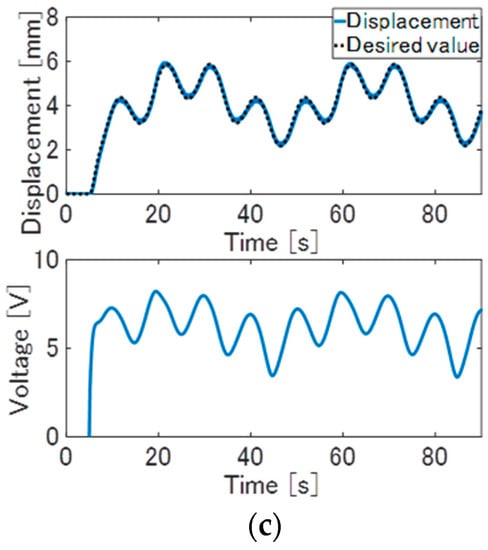 Experiment results of the feedforward control are shown in Figure 6. In this figure, the solid line is the displacement of the TCPA, and the dotted line is a desired value, that is, the reference signal after passing through the reference model F(s). From Figure 6a,b, although the displacement is varied along the reference signal, the large tracking error between the displacement and the desired value arises. From Figure 6c, the large tracking error that arises is the same as with the result of the sinusoidal wave of 0.1 Hz and 0.025 Hz. This tracking error is considered to arise due to the unconsidered factors such as nonlinear thermal conductivity [], mechanical property [], noise, the parameter variation due to the temperature dependence and the coil–coil contact, and so on. Furthermore, these parameters might be varied due to the coil–coil contact, and so on. Therefore, with the reference of Yip and Niemeyer [], Arakawa et al. [], and Suzuki and Kamamichi [], the feedforward control based on the LTI model cannot realize the desired response.