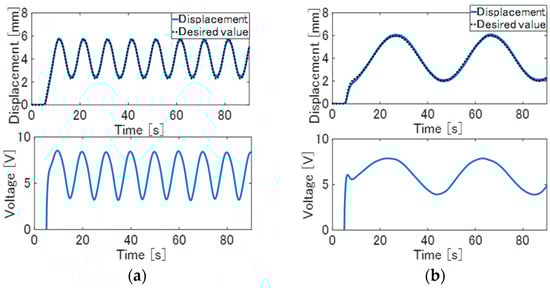 The experimental results of the internal model control are shown in Figure 7. In each of the control results, the large error decreased, and the displacement of the actuator can be tracked to the desired value compared to the feedforward control. As observed in the results, the desired control performance can be realized due to the feedback of deviation between the actual output and the estimated output of the nominal model. In the experiment, the displacement control can be realized in the same response performance for the other amplitude and frequency of the target signal if the input voltages are within the upper limitation of the input saturation. Therefore, as shown in the results, the internal model control can eliminate the nominal error and disturbance, and also realize the desired control performance.