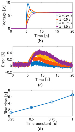 We verified that the proposed control method can realize the desired control performance. Here, as with the method of the reference of Yip and Niemeyer [], the rise time is recorded when the pole of the reference model is varied. In the experiment, the time constant λ is changed from 0.25 s to 1 s per 0.25 s. Note that the pole is a reciprocal of the time constant λ. The reference signal is the step wave with amplitude of 3 mm. These parameters are determined, so that the control input is not saturated to evaluate the dependence of the time constant.