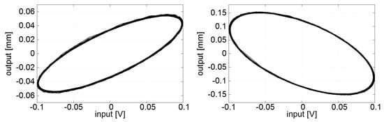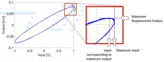 Additional difficulty arises in the modeling of the bimorph piezoelectric actuator as the frequency of the driving input signal increases. This difficulty is the phase lag between the input and the output. It will appear simultaneously with the hysteresis of the actuator. Figure 3 shows the input/output plane trajectory of the actuator response to a 35 Hz pure sinusoidal input. This is a hysteresis loop of the actuator. However, the zoomed part of the figure clearly shows that the output response of the actuator exhibits phase lag to the driving input signal. This behavior cannot be seen in Figure 2. The source of actuator displacement is physically an inverse piezoelectric effect which exhibits hysteresis. It is natural to infer that the model we develop should have mathematical structures to account for both the hysteresis and the phase lag originating from the cantilever structure of the actuator. We have accordingly proposed the extended Bouc–Wen model to capture this behavior []. The extended Bouc–Wen model is formulated by