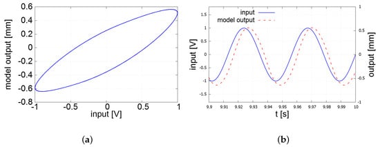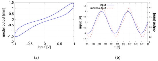 where is the model output, is the input, and represents the hysteresis component, all at time sample k. This model can be obtained by replacing the symbol A in (2) with the expression , intending to introduce the velocity sign sensitivity to the behavior of the model which would lead to the asymmetric off-center hysteresis loop formation. It is fair to say that this idea is a simplified version of the generalized Bouc-Wen model proposed in []. The IIR filter structure that can be found in the second equation is a mathematical representation of the structural dynamics of the thin bimorph actuator. The symbols , and form the set of parameters of the extended Bouc–Wen model. Figure 4 illustrates the capability of the extended Bouc–Wen model (3). This response was calculated using the model (3) with fictitious parameter values. Phase lag can be observed clearly in Figure 4.