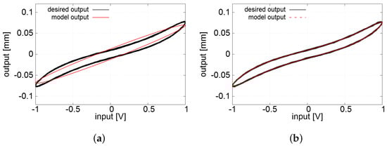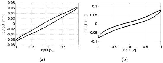 The model outputs and the measurement of the actuator displacement to the 23 Hz sinusoidal input. The proposed enhanced Bouc–Wen model (6) shows good accuracy, whereas the previous extended Bouc–Wen model fails to capture the twisted shape of the hysteresis loop. (a) Result with the extended Bouc–Wen model in []; (b) Result with the enhanced Bouc–Wen model (6).