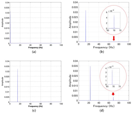 The results of the fast Fourier transform (FFT) analysis of the responses of our piezoelectric actuator to (a) 1, (b) 14, (c) 15, and (d) 23 Hz sinusoidal inputs.