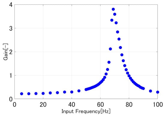 Frequency response characteristics of the bimorph piezoelectric actuator used in this study. It was measured experimentally using a pure sinusoidal input whose frequency was altered from 1 Hz to 100 Hz. It can be seen that this actuator has mechanical resonance at approximately 70 Hz.
