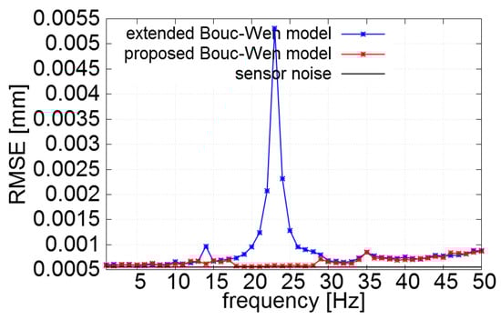 Figure 16 shows the root mean squared error (RMSE) values of the tracking control. The proposed hysteresis compensation with the third/fifth harmonic attenuation clearly outperformed the controller based on the extended Bouc–Wen model, which does not consider the third/fifth harmonics. Figure 17 shows the result of the tracking control to the 23 Hz reference in time domain. High precision tracking was achieved with the proposed controller shown in Figure 17b, whereas moderate tracking error remains in Figure 17a.