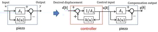 We start from the derivation of the hysteresis compensation input . It is based on the idea referred to as the direct inverse multiplication proposed by Rakotondrabe [] which is schematically described by a block diagram in Figure 12.