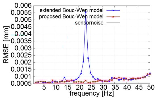Figure 10 shows that the extended Bouc–Wen model produced a large modeling error at the frequency where odd harmonic oscillation was observed, whereas the error was eliminated when the proposed enhanced Bouc–Wen model was applied. Figure 11 shows the hysteresis loops calculated with the extended Bouc–Wen model and the proposed enhanced Bouc–Wen model (6). The modeling precision attained with the proposed enhanced Bouc–Wen model with the third harmonic component was much better than that with the extended Bouc–Wen model.