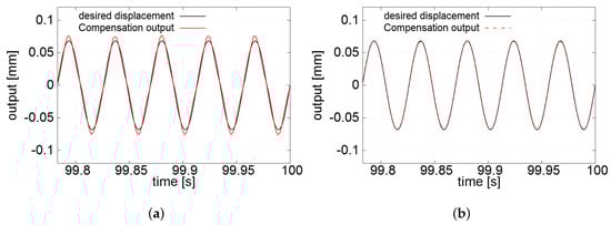Time domain comparison of the output displacement of the piezoelectric actuator and the reference trajectory. (a) Result of compensation for 23 Hz input: control input is synthesized with only (16) and (17); (b) Result of compensation for 23 Hz input: control input is synthesized with the proposed control law (20).