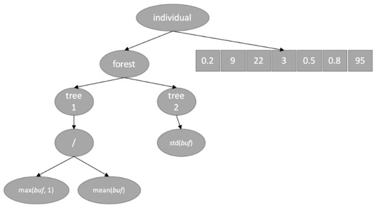 - Fitness evaluation, phase A: Obtaining the sets of features and hyperparameters for each individual by parsing the trees in the forest and the linear chromosome.