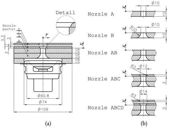 - The fourth nozzle was denoted as ABC (it consists of three nozzle plates A+B+C, see Figure 1a) and had a special novel design with rounded lips at both inner and outer nozzle ends. A similar shape was tested by Lee and Goldstein [36] for a slot-type nozzle. However, this study’s nozzle was circular and equipped with a small step at the end of the straight nozzle section. This step promoted flow separation and prevented flow reattachment during extrusion stroke.