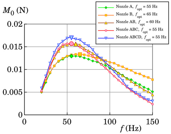 In order to determine the optimum frequency at which the synthetic jet thrust was a maximum, the frequency characteristics were measured. Measurements were taken using a precision scale within the frequency range of 20–150 Hz for one selected power input: 1.02 W. The resultant curves can be seen in Figure 2, where for each curve one peak indicates the maximum SJ thrust. The peak maxima are similar for each of the tested nozzle shapes. For A, ABC, and ABCD nozzles, the same optimum frequency was found of 55 Hz. In the case of the nozzle AB, the frequency with maximum thrust was 60 Hz and in case B it was 65 Hz (these frequencies are also summarized in Table 2). Note that all found optimum (or resonance) frequencies are very close to the natural frequency of the loudspeaker, which is around 68 Hz, and were used in the following experiments, where the input power was varied.