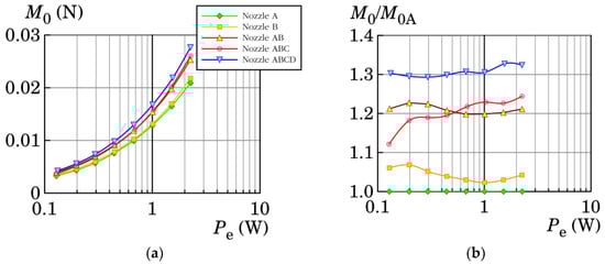 The synthetic jet thrust was measured for each nozzle at several input power levels defined in Table 1. The obtained dependencies of the SJ momentum flux on the input power, Pe, are plotted in Figure 3a. As expected, the curves show monotonically increasing trends. For better comparison of the nozzles, Figure 3b shows relative results with respect to reference nozzle A. With the help of Figure 3b, it can be concluded that the lowest momentum fluxes were achieved using nozzle A and the highest momentum fluxes were achieved with nozzle ABCD. Namely, nozzle ABCD caused a 29–33% enhancement of the momentum flux in comparison with the reference nozzle A. It can be also seen that the resultant momentum fluxes for nozzles A and B were similar, as well as for nozzles AB and ABC. The comparison of the curves in Figure 3b proved that the auxiliary nozzle in the ABCD arrangement was successful in directing the radially dispersed momentum flux. The radial dispersion of the fluid was supposedly caused by the outer nozzle fillet; i.e., nozzle part C.