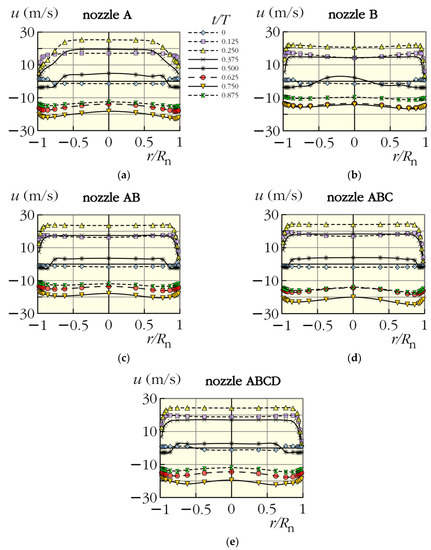 Comparing Figure 4c–e, another slight difference is noticeable for nozzle ABCD, where a bit higher velocities were measured than in remaining cases.