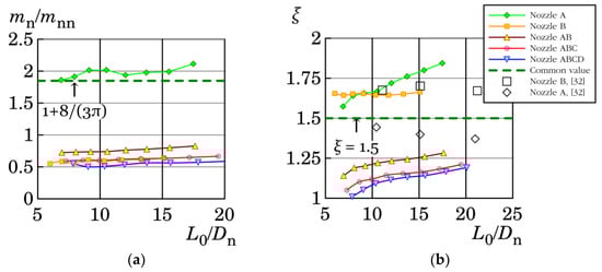 Based on the measurements of cavity pressure variations and spatial integration of velocity profiles, the parameters mn and ξ were evaluated. The evaluation method is summarized in Appendix A and the results are shown in Figure 5a,b. The mass of the moving fluid inside and outside a nozzle, mn, is plotted here in a dimensionless form. Namely, it is related to the mass of air inside the nozzle, mnn. The ratio mn/mnn is shown in Figure 5a as a function of the dimensionless stroke length, L0/Dn, where the stroke length, L0, was evaluated using Equations (1) and (3). The theoretical value of this ratio for a cylindrical hole is displayed with graphs in Figure 5a and this value, 1 + 8/(3π), reasonably agrees with the results for the cylindrical nozzle A. Furthermore, it was found out that relative to their volumes the nozzles (B, AB, ABC, ABCD) employed much less air into the motion than nozzle A and their ratios mn/mnn were very similar. It is also noticeable that all evaluated ratios mn/mnn had a very weak dependence on the dimensionless stroke length, L0/Dn and, therefore, in a first approximation, they can be assumed constant.