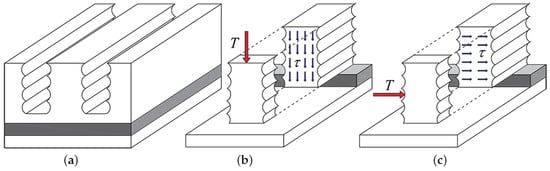 A simplified representation of the SOI wafer after four cycles of the D-RIE process (a), and of a cantilever beam after oxide wet etching, subject to out-of-plane (b) and in-plane (c) shear tension.