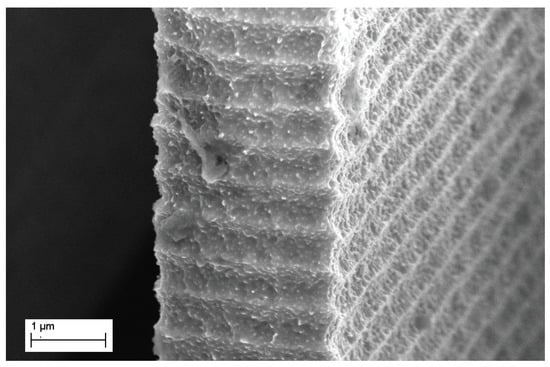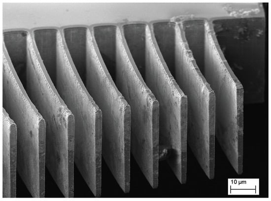 As discussed in the next paragraph, one source of strength decay is the stress concentration factor, which holds in those zones where surface discontinuities appear. In high aspect ratio DRIE Bosch process, problems and challenges regarding scalloping attenuation have been reported in various investigations [,,,,,], although the problem presented several difficulties.