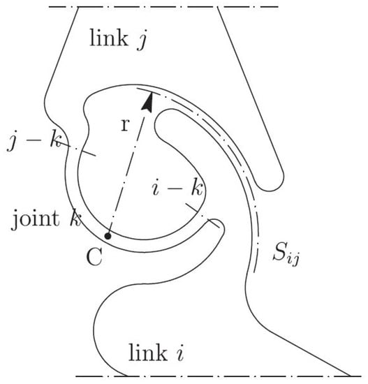 The presented methods can be specialized for the study of the above-mentioned class of CSFH-based microdevices. A member of this class is characterized by the presence of an embedded CSFH hinge, which is composed of a flexible curved element connecting a couple of conjugate profiles. One possible configuration is depicted in Figure 7. Relative motion among the pseudo-rigid parts i and j is possible because the thin cross-section of the curved element k behaves as a flexible rod.