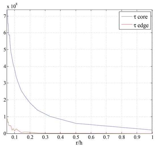 The proposed analytical method gave us the opportunity to calculate stress in many different points and sections. For example, and could be calculated as a function of the ratio of the notch radius r to the circular section radius h. The results obtained have shown that the maximum stress decreases as increases. This is consistent with the physics of the phenomenon since, as h reduces in size, the discontinuity in the field becomes less severe. Considering the edge points, also shows a similar decreasing trend as h decreases. As mentioned above, its magnitude remains significantly lower than the stress achieved at the notch core. Figure 15 shows the dependency of and upon the ratio.