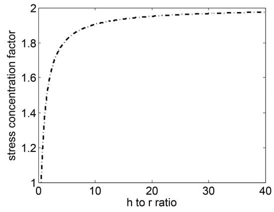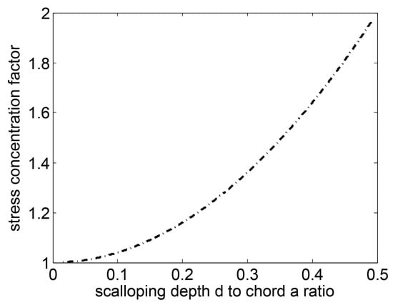 Thanks to the above-presented analysis, it is possible to state that the stress concentration factor tends asymptotically to the theoretical value 2 as the scalloping depth increases with respect to the scalloped chord, where the limit value is already known in the literature (see, for example, Ref. []).