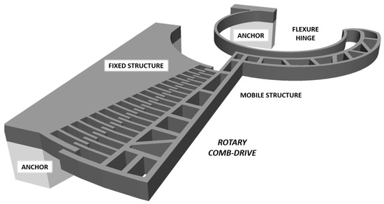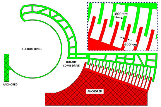 The drastic reduction of complexity made possible by the CSFH principle, together with its minimization of internal stresses and its robustness in operation, can facilitate the scaling process from a Micro-Electro-Mechanical System to a Nano-Electro-Mechanical System (NEMS), with new challenges in terms of mechanical movement, actuation possibilities and applications [28,29,30]. In this work, the properties of a NEMS rotary comb-drive nano-scaled actuator is introduced, its design is inspected, its electro-mechanical behaviour is theoretically and numerically studied and a new technological procedure for its fabrication is described, making it able to integrate in standard systems as well as in wearable/flexible systems, polymer substrates or in glass devices, with a variety of applications in the field of mechanical manipulation, such as nano-surgery, lab-on-chip bimolecular analysis, or nano-movimentation in space environment.