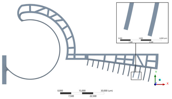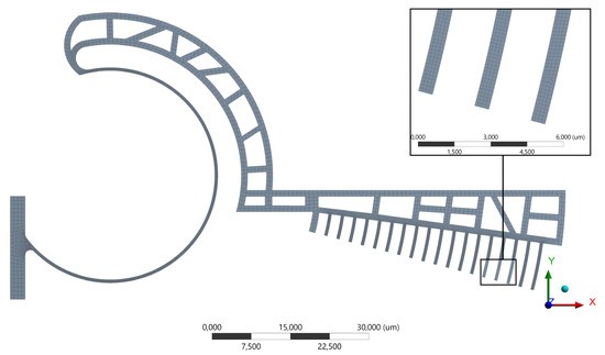 Figure 6 reports the generated mesh, composed of 8065 nodes and 6423 elements, and refined in correspondence to the flexible beam and to the comb drive fingers.