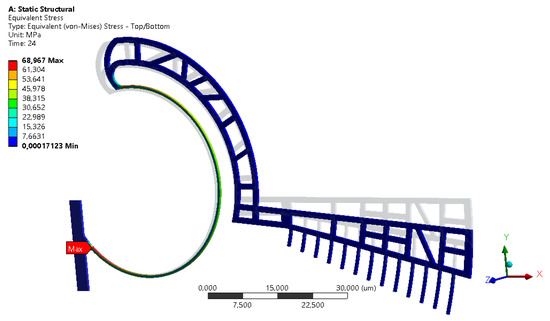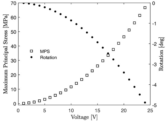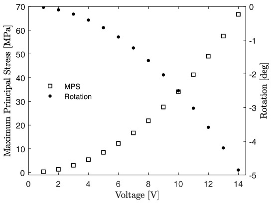 The rotation of the floating part and the maximum value of the maximum principal stress (MPS), for increasing values of the applied voltage, are reported in Figure 4. The value of 14 V corresponds a rotation of 4.85°, close to the maximum rotation permitted by the comb-drive geometry (5°). This case is represented in Figure 5, showing the deformed and neutral configurations of the structure and the stress distribution on the flexure. The maximum MPS value is equal to 66.7 MPa. Yield strength of polycrystalline silicon is equal to 1.2 GPa [33,34].