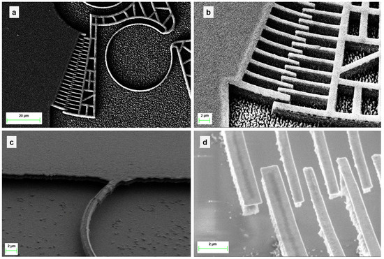 Figure 10a,b show a top view (top left) of the whole device during the structure patterning phase, with an enlargement on the comb fingers (top right). Figure 10c,d show the crucial parts of the device suspended and detached from the substrate after the releasing process: the attachment between the hinge of the actuator and the anchor (bottom left), and the comb-drive fingers (bottom right). The displayed devices have n-doped a-Si:H, deposited by Plasma Enhanced Chemical Vapour Deposition (PECVD), as structural layer, with the following parameters: