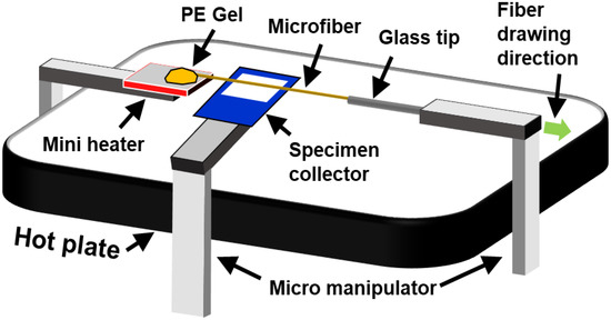 Next, we devised a two-stage tip drawing method. First a µm-scale UHMWPE fiber (MF) was drawn, as schematically represented in Figure 1. There, a 5 mm × 5 mm silicon chip with a thin film heater attached on the backside heated the gel to 120–130 °C. The temperature was measured using a thermocouple attached to the thin film heater. A hot plate placed 1 cm below the silicon chip heated the overhead air to 90 °C to prepare for hot-stretching. The translucent gel transformed to a transparent solution as it reached 130 °C. As the solution became clear, a sharp (~10 µm) glass tip was inserted into the solution using an XYZ-axis micromanipulator. It drew a MF of short length (several hundreds of µm). The drawing induces stress-induced crystallization with folded chain lamellae (kebab) on oriented chains (sheesh). Upon drawing, the lamellar structure unfolds into microfibrils that are pulled taut between entanglements [4]. During crystallization, the decalin evaporates, aided by the convective current from the hot plate. Decalin syneresis further facilitates crystallization. The fiber was then further drawn to a length of 1 cm, after which it was quenched to room temperature to minimize relaxation of the extended chain.